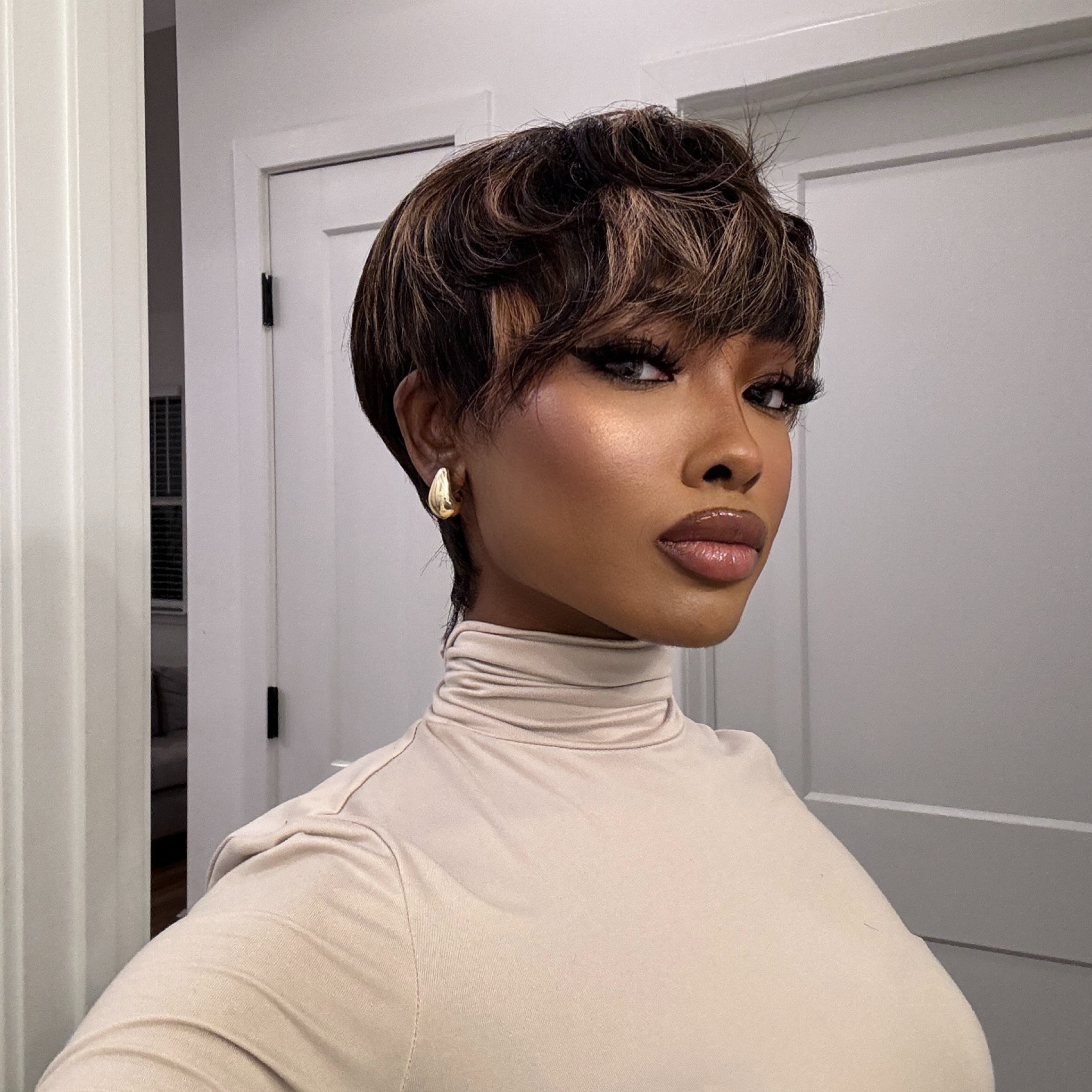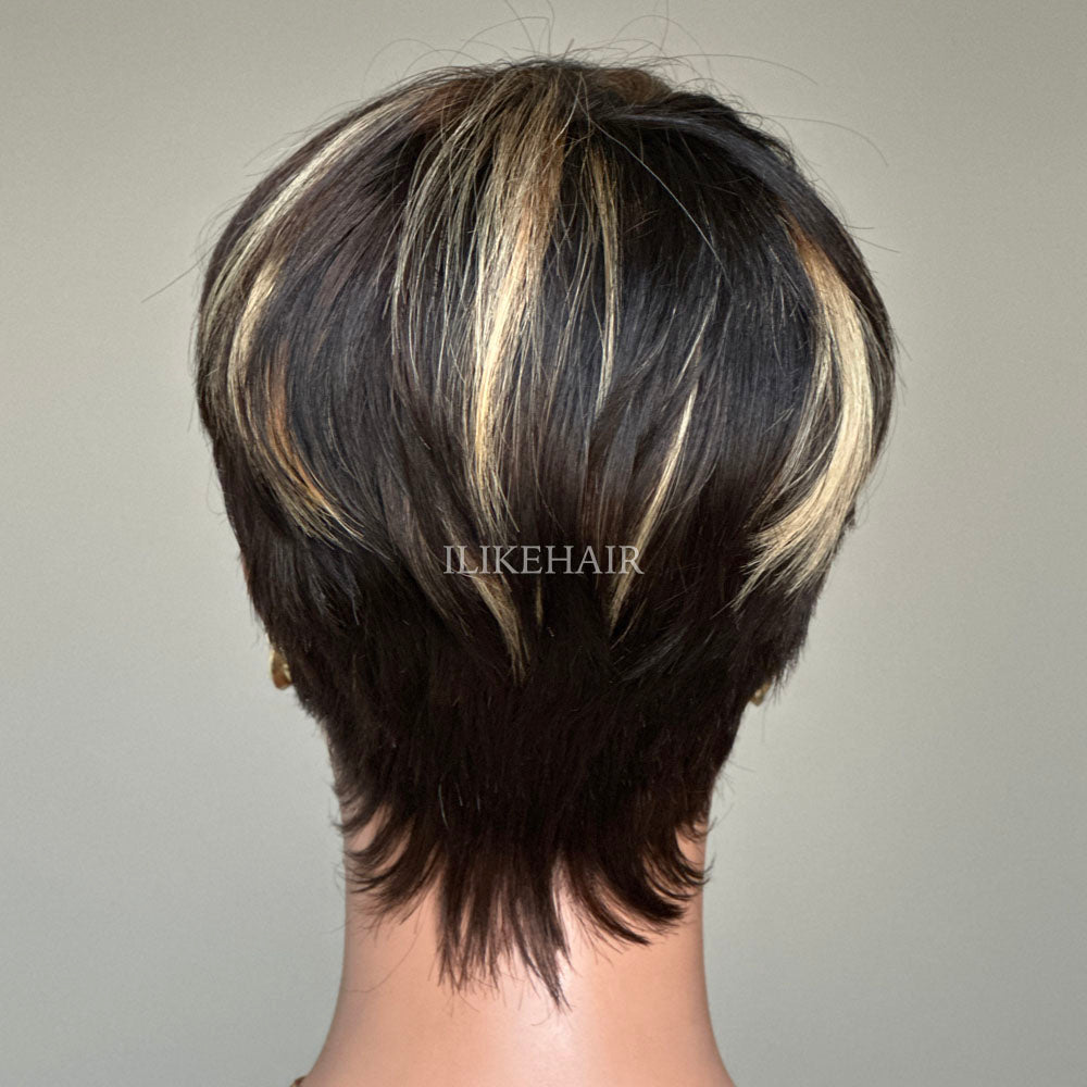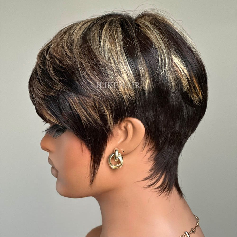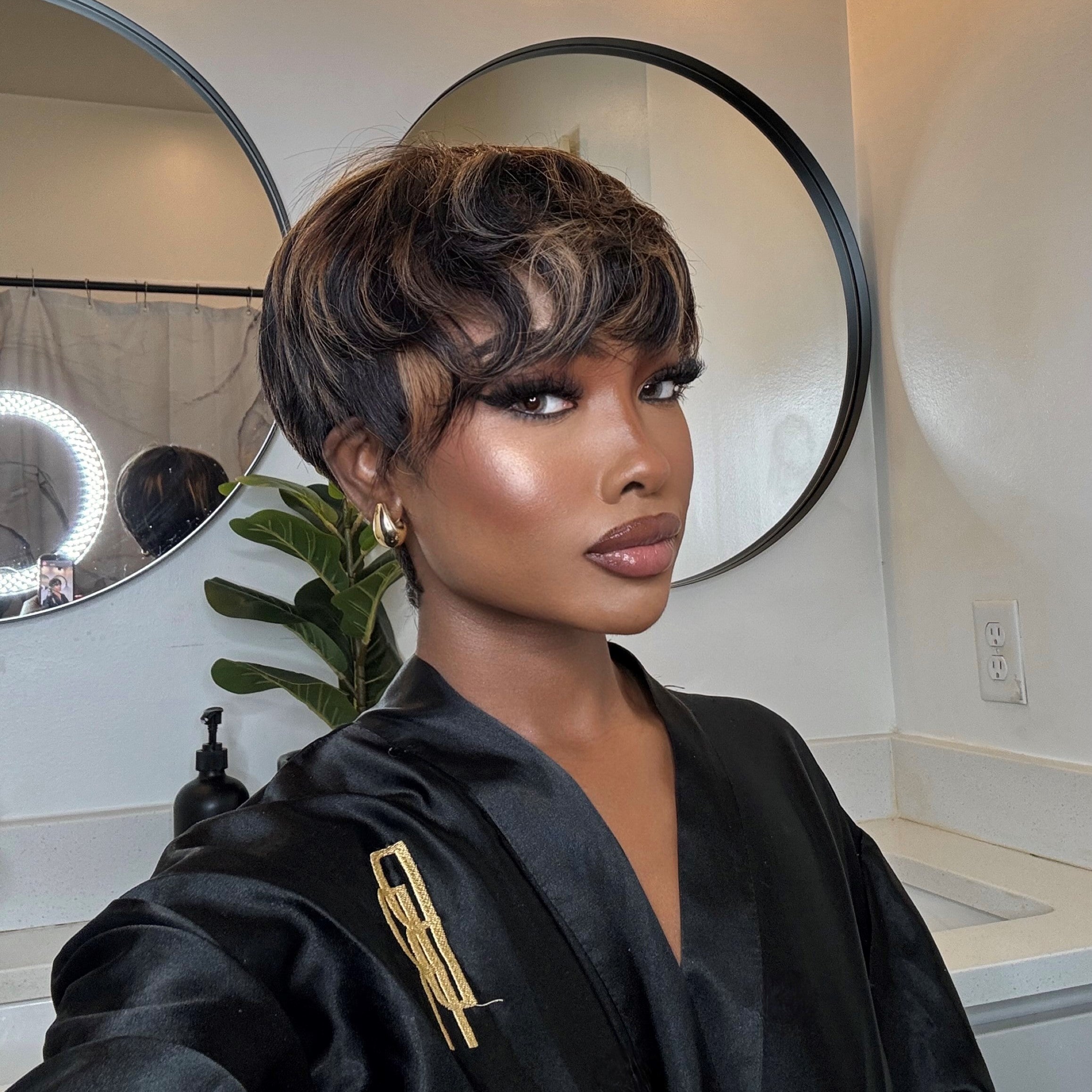 • Put On & Go Blonde Highlight Layered Pixie Cut Wig With Bangs